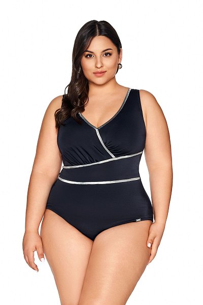 Купальник совместный выполнен с мягким лифом, на запах, с внутренней стороны спереди купальник продублирован сеткой, к лифу пришиты поролоновые вкладыши, под грудью корректирующая резинка, широкие бретели разгружают позвоночник, а блестки в виде блестящих лент добавили костюму легкости и элегантности.