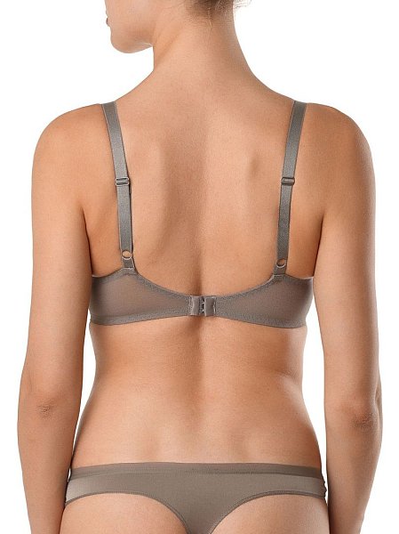 Бюстгальтер из эластичного сетчатого полотна. На каркасах. Чашка формованная из трикотажного многослойного полотна с мультифиламентной нитью - монофил. Верхний срез и срез проймы чашки обработаны отделочной тесьмой на машине зигзагообразной строчки.