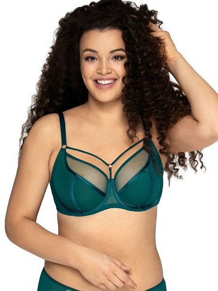Бюстгальтер на косточках, чашки шитые, нижняя часть из гладкого трикотажа, верхняя часть чашки из сетки, особый шарм придают атласные ленты, отороченные разноцветной блестящей нитью. В зоне декольте декоративные бретели. Бретельки не отстёгиваются, регулируются.