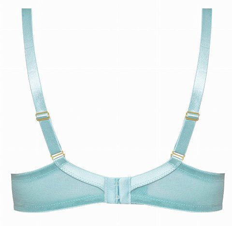 Бюстгальтер на косточках, с дополнительными боковыми поддержками, чашки мягкие, шитые из сетки с вышивкой, верх чашки из сетки, бретельки не отстёгиваются, регулируемые. На спине застёжка на удлинитель, количество крючков в ряду застёжки увеличивается пропорционально размеру бюстгальтера.