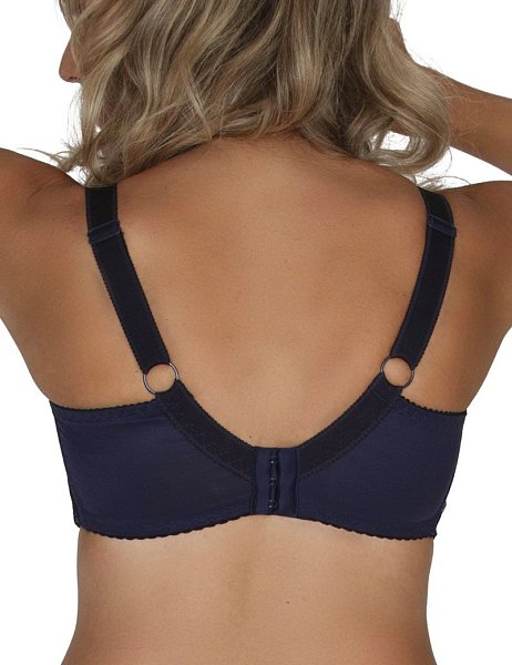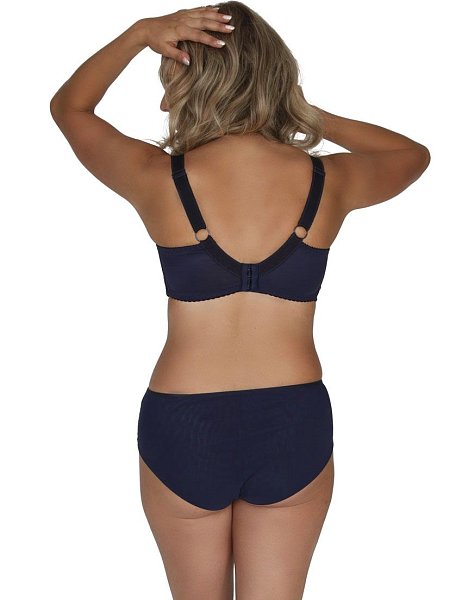 Бюстгальтер A-71 M в темно-синем цвете выполнен на косточках, с боковыми поддержками, чашки мягкие, шитые из гипюра с цветочным рисунком, продублированы телесной сеткой, верх чашек из сетки и кружева с «ресничками», спинка из плотной сетки. Бретельки не съемные, регулируются по длине, на спине застёжка - удлинитель на крючках, фурнитура металлическая крашеная.