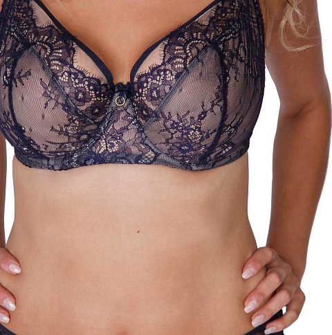 Темно-синий бюстгальтер с мягкой чашкой +size из кружева с «ресничками»