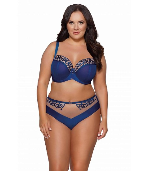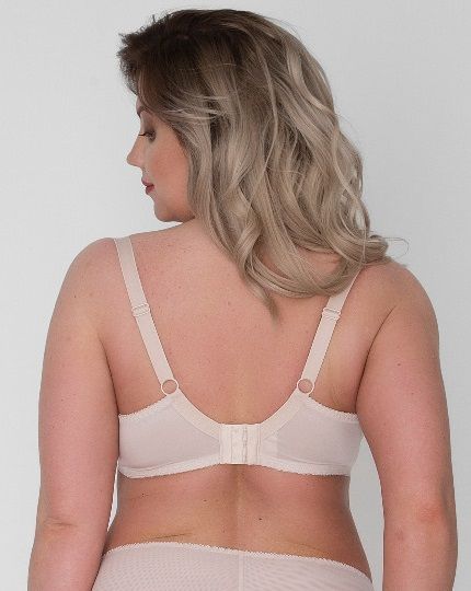Бюстгальтер выполнен на косточках, с боковыми поддержками, чашки шитые, нижняя часть с тонким поролоном, внутренняя сторона прошита хлопковым трикотажем, внешняя из трикотажа с тиснением в виде ромбов , верхняя часть из тонкой сетки. Бретельки не отстёгиваются, регулируются по длине, на спине застёжка - удлинитель на крючках, фурнитура металлическая крашеная.