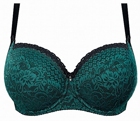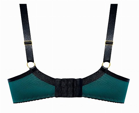 Бюстгальтер на косточках, чашки шитые, нижняя часть чашки на тонком поролоне черного цвета, внутренняя сторона проложена хлопковым трикотажем, внешняя покрыта кружевом изумрудного цвета, верхняя часть чашки из кружева, продублирована черной сеткой. Бретельки пришиты, регулируются по длине. На спине застёжка на удлинитель, количество крючков в ряду застёжки, увеличивается пропорционально размеру бюстгальтера.